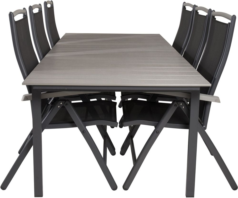 Spisegruppe med et bord og 6 stykker stole. Stolene er lavet af Aluminium/Tekstilerne/Aintwood og bordet er lavet af Aintwood/Aluminium.