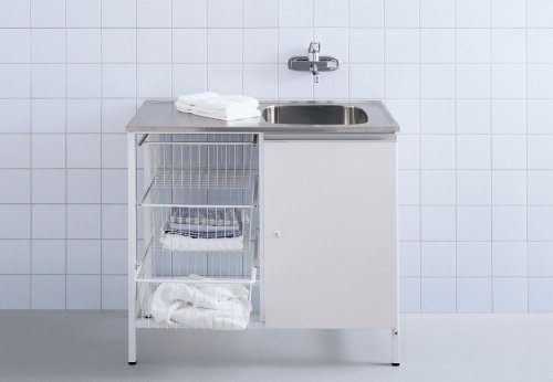 Et smukt badeværelsesskab i mange varianter med en række praktiske detaljer. Bordplan i mønstervalset rustfri stålplade og en stor håndvask. Gulvstativ lavet af pulverlakeret metal med justerbare plastfødder.