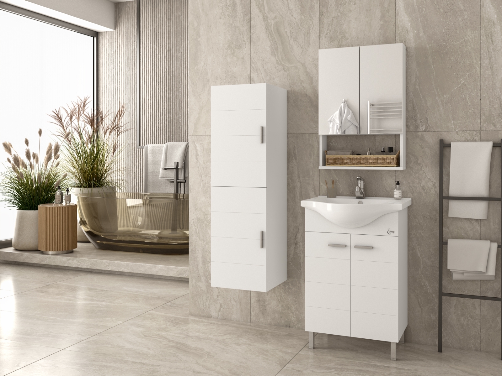 Capri-møbelpakke fra Nordamist med et hvidt gulvstående badeværelsesskab, porcelænshåndvask og et spejl.
