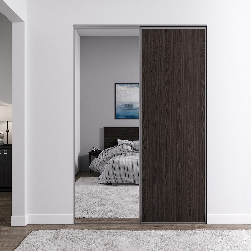 Praktiske skydedøre til garderobe i spejl/panel-design. Denne opbevaringsløsning med 2 døre passer godt til mindre rum, hvor du vil skabe lidt ekstra opbevaringsplads og få mere orden i dine ting. Designet er stilfuldt, enkelt og pænt.