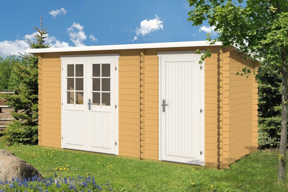 - Døre og vinduer: Fremstillet af ekstra tørret lamineret gran. Vinduer med ét glas, der åbner indad og udad. Alle komponenter til montering medfølger.
