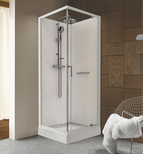 Komplet brusekabine med udadgående dør. Inkluderet: armatur, loftbruser, håndbruser og lille hylde til toiletartikler og lignende. Også inkluderet er gulvafløbet i kabinen samt rør/vandafstrømning fra dette. Glaspartierne i brusekabinen er fremstillet af hærdet sikkerhedsglas med glasbeskyttelse som standardindstilling. Glasbeskytteren GLASS PROTECT er en overfladebehandling, der gør, at vandet lettere løber af og efterlader meget lidt kalk og snavs. Modellen fås i flere størrelser.