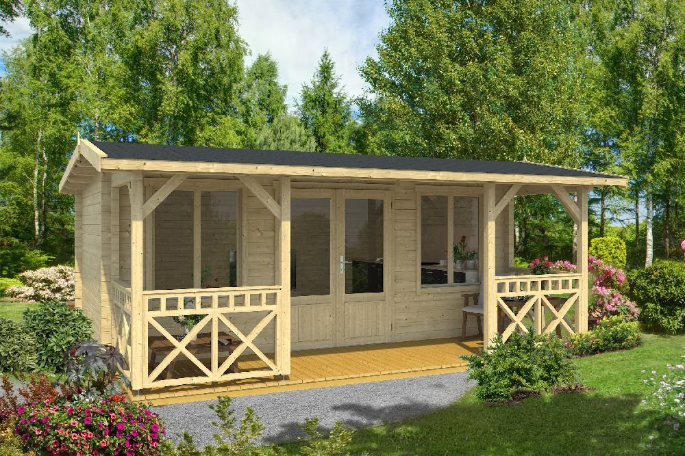 Tag og gulv består af 18 mm råplade, dette medfølger i sættet. Behandlede bæreliner til fundamentet er også inkluderet. Du skal selv lave fundamentet, materialer hertil medfølger ikke. Hvordan fundamentet er lavet afhænger af jordbundsforholdene, husets udseende og hvad du foretrækker. Der kan enten støbes en plade eller der kan anvendes sokkelbund på fx havefliser eller letklinkerblokke.
