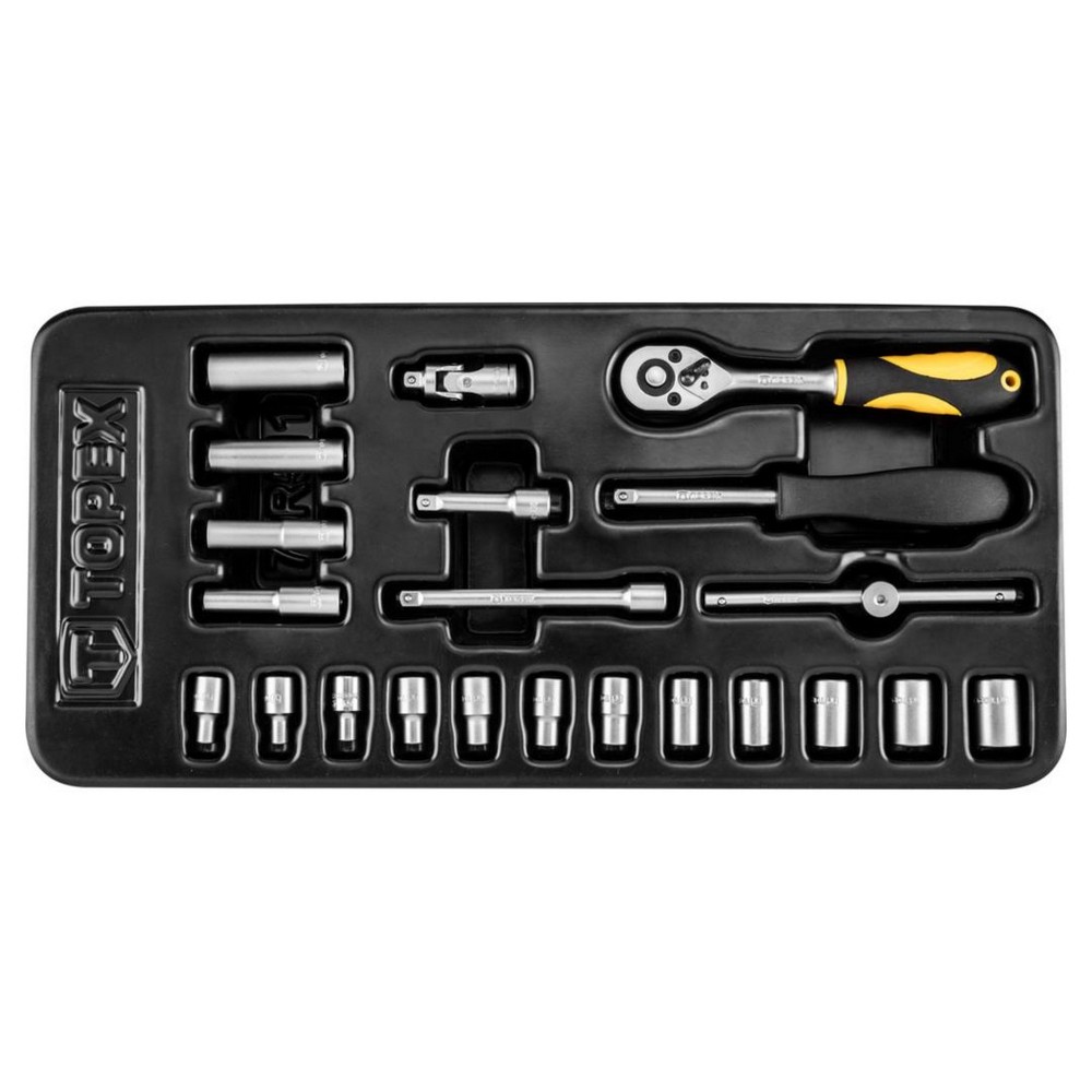 Ærmesæt med 21 dele sorteret i fleksibel plastholder. Alle dele er lavet af slidstærkt stål, der giver en lang levetid.