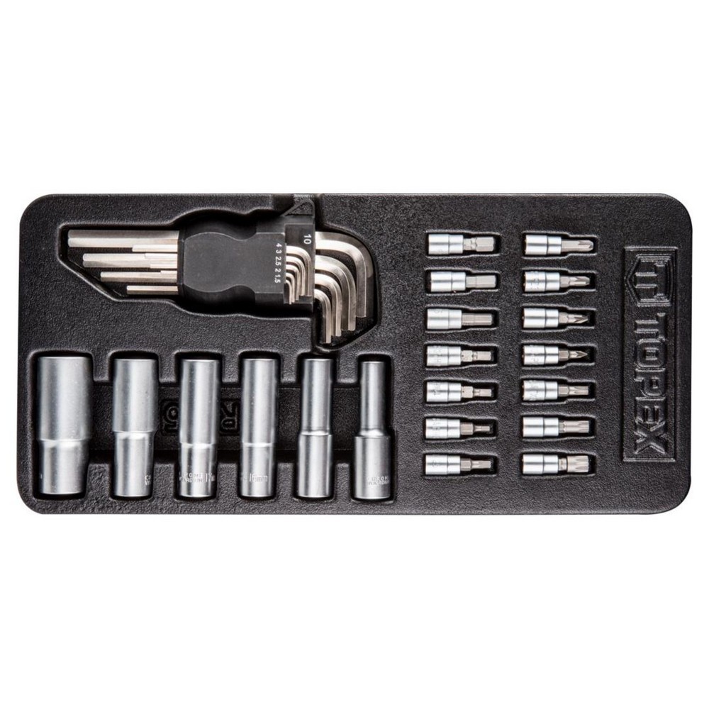 29-delt fatningssæt, et alsidigt sæt til mekaniske opgaver, med unbrakonøgler, bits og fatninger. Tilbehøret er sorteret i en plastikholder.