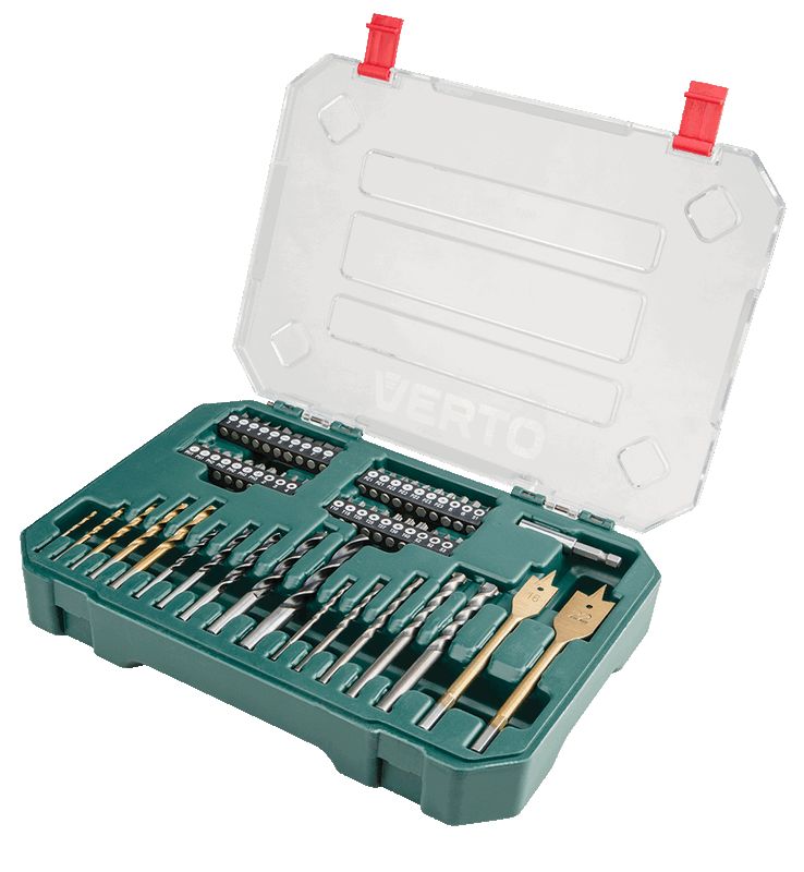 Sæt med bor og bits til metal-, træ- og betonarbejde. Sorteret i en praktisk æske.