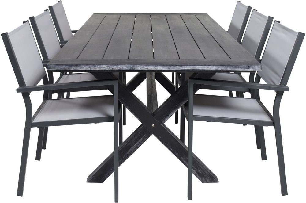 Spisegruppe med et bord og 6 stykker stole. Stolene er lavet af Aluminium/Tekstilerne og bordet er lavet af Akacia. Stolene kan stables.