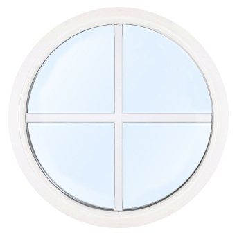 Rundt, fast vindue med isolerende 3-glasrude, energiglas og argongas. Design med klart glas. Karmdybden er 68 mm. Vinduet er malet i Hvid NCS S0502-Y (med andre farver som en tilvalg). U-værdi: 1.1.