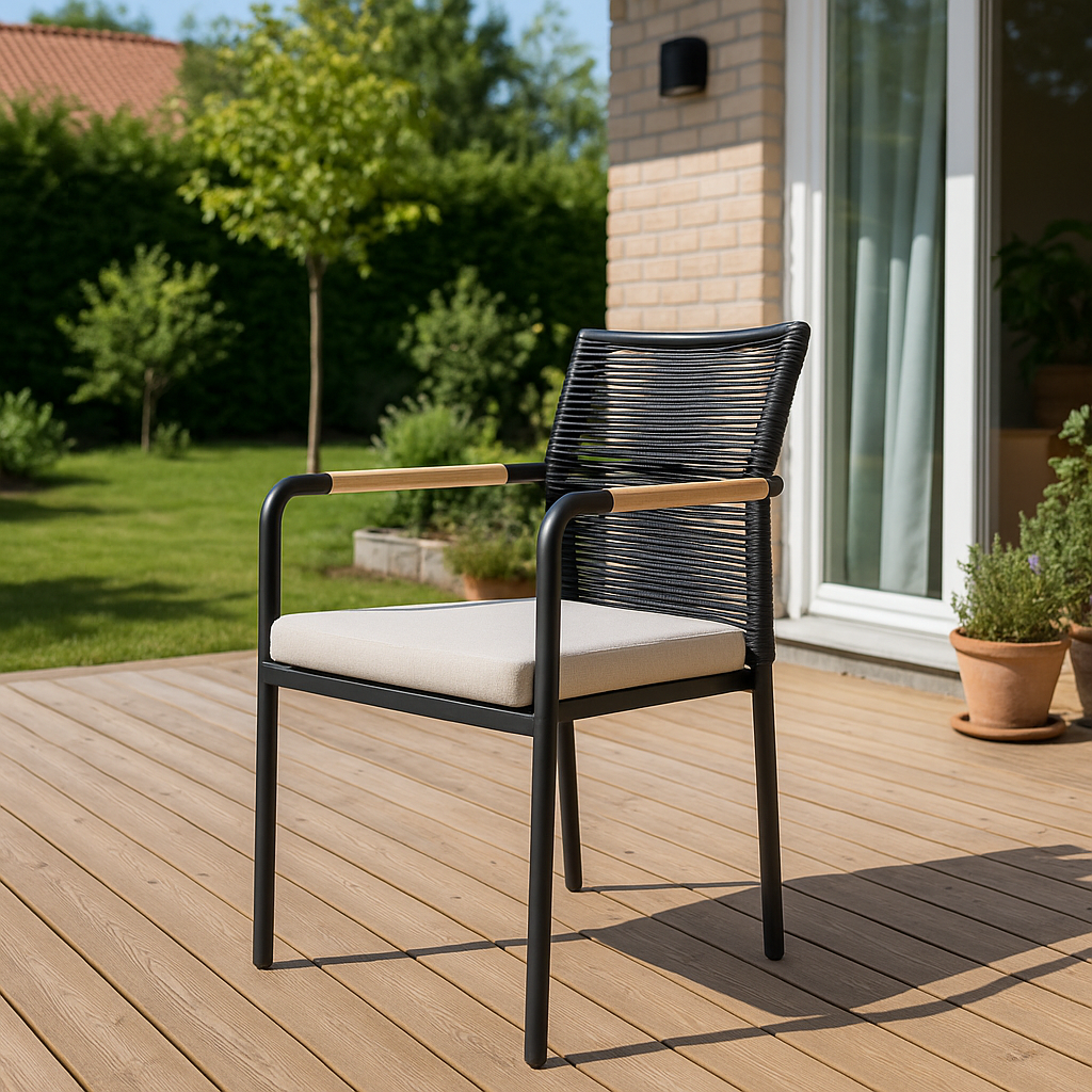 Saltö spisegruppe til terrassen med rektangulært spisebord i massiv teaktræ, sammen med Skanör lænestol i sort og teaktræ med behagelig beige sædehynde. En moderne kombination på terrassen.