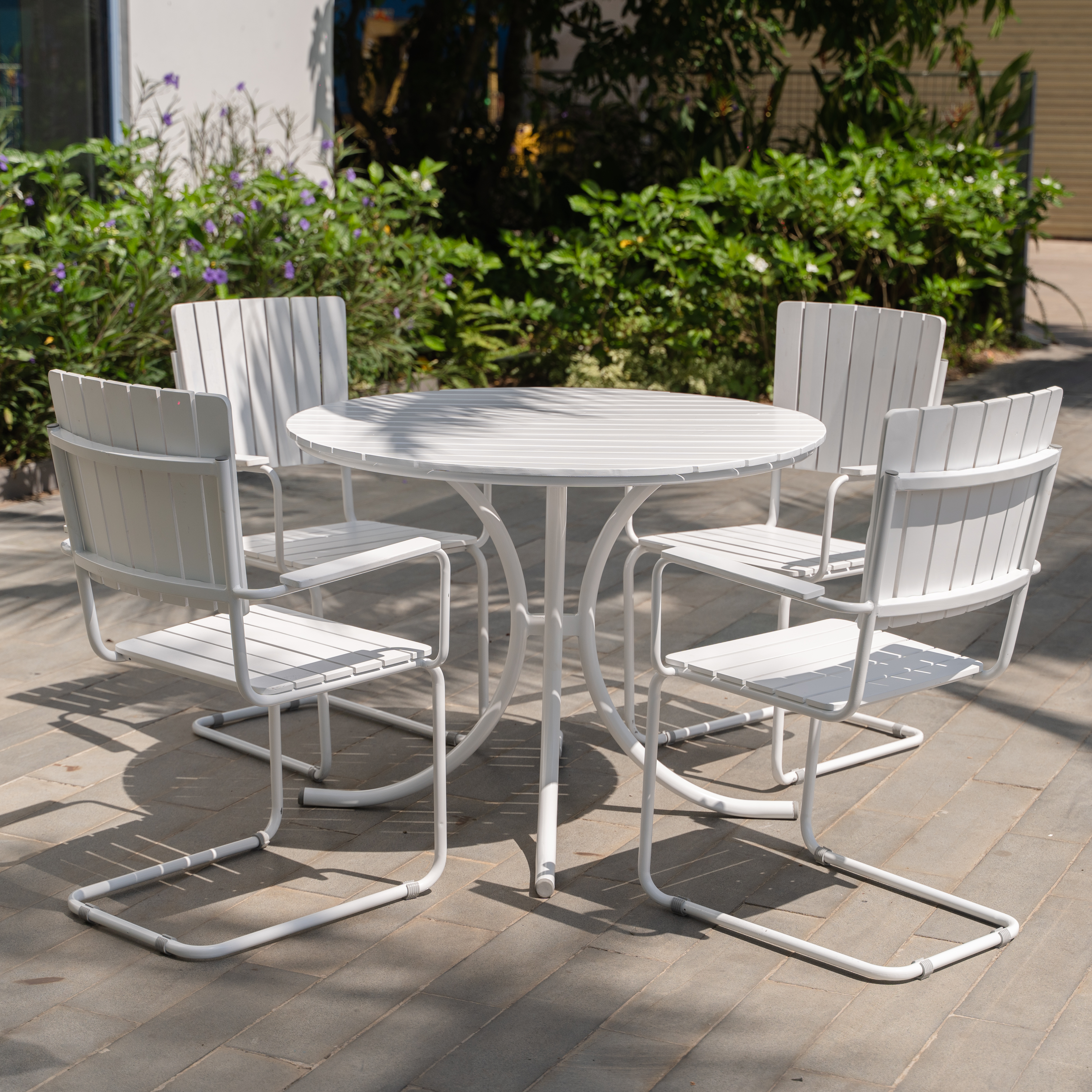 Sandby er et klassisk udendørs spisebordssæt, fremstillet af aintwood og ramme lavet af holdbart metal. Dette gør det udendørs spisebordssæt vejrbestandigt og i stand til at klare udepladens miljø. Hele sættet er hvidt med et skandinavisk design.