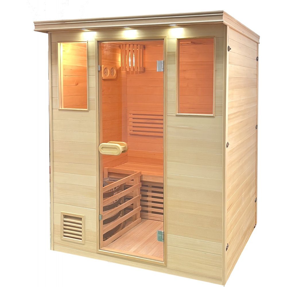 Denne sauna til 3 personer er designet til at give en afslappende og luksuriøs saunaoplevelse i hjemmet, feriehuset eller spaen. Med dimensioner på 150x120x190 cm er saunaen kompakt, men stadig rummelig nok til at skabe en behagelig oplevelse.