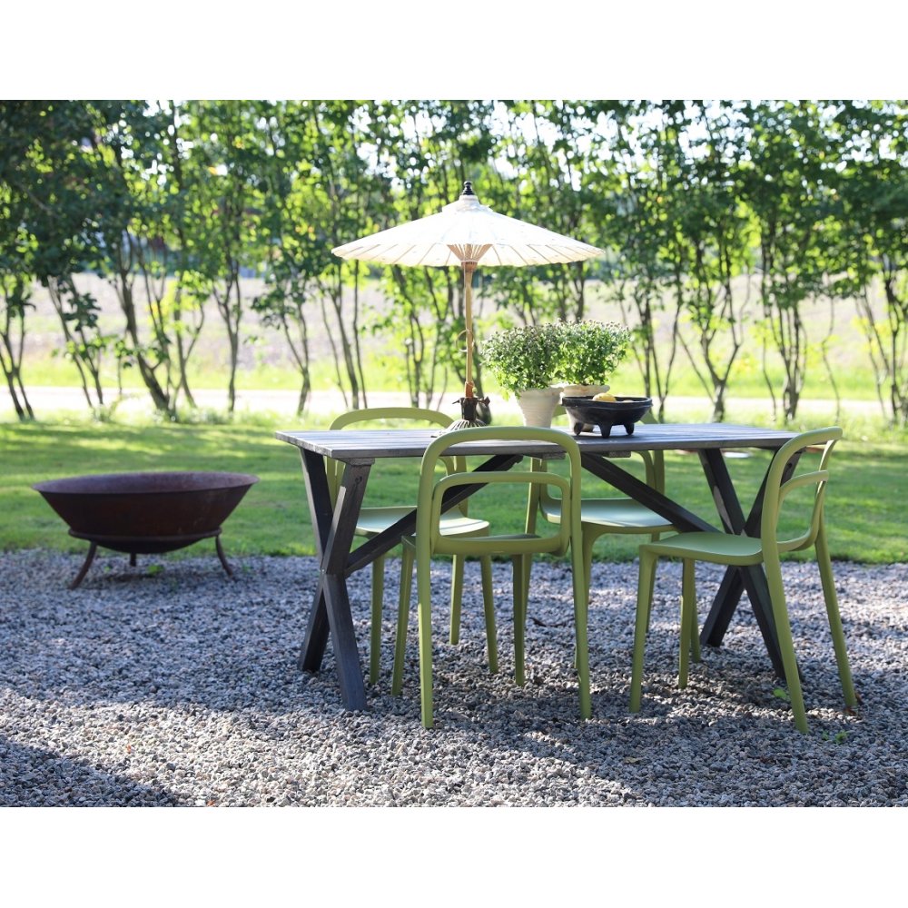 En smuk spisegruppe til terrassen. Scottsdale spisebord i grå laseret fyrretræ med 4 stabelbare Nordanå stole i grøn formstøbt plast. En spisegruppe i harmoni, hvor møblerne går fint sammen og skaber en helhed, der er svær at slå. Passer lige så godt i udestuen som på altanen.