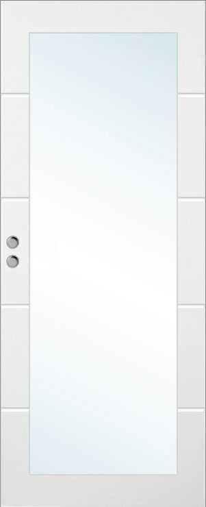 Malet, kompakt skydedør med rillet dekoration og glasrude for højt indslip af lys.