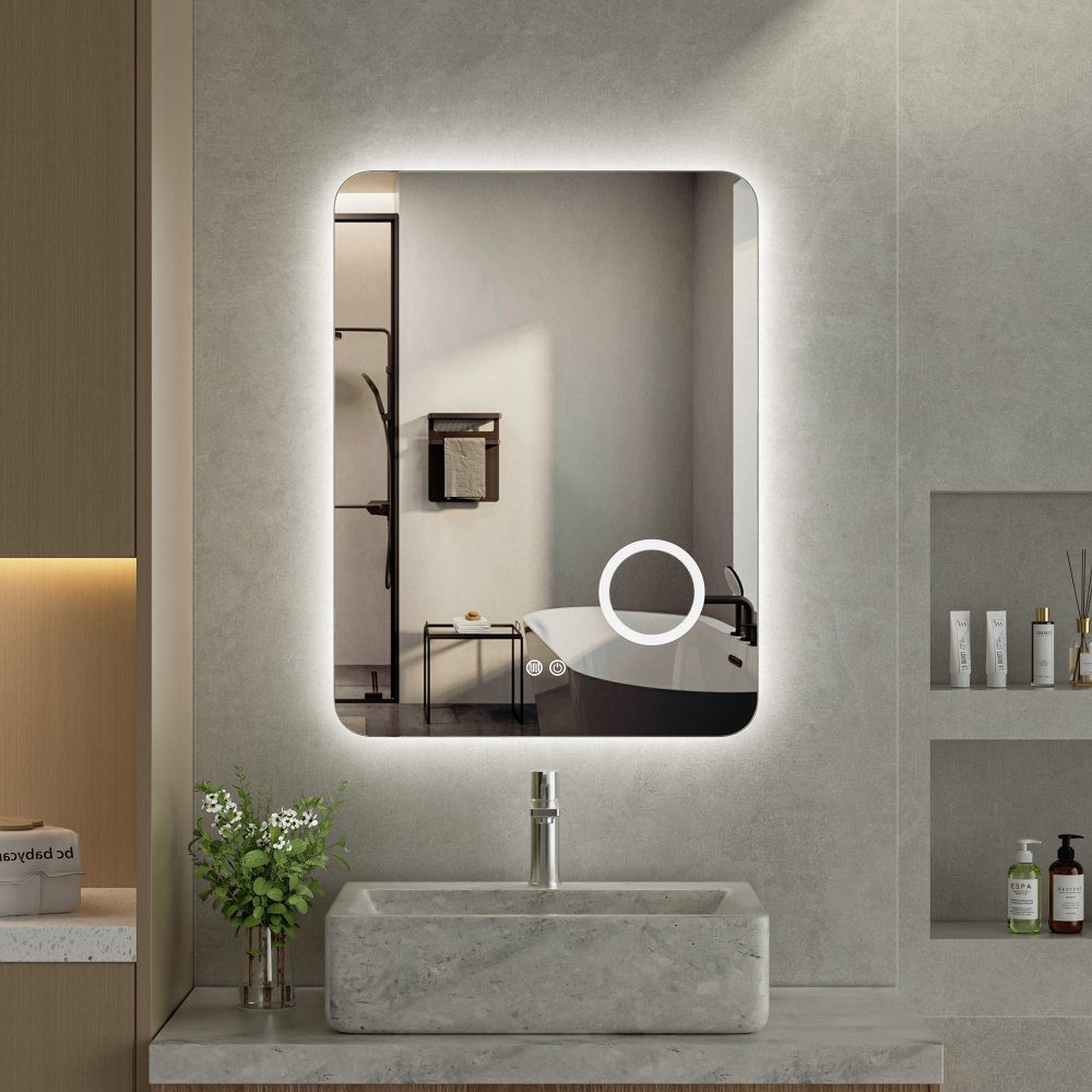 Dette elegante LED-spejl er både praktisk og stilfuldt - perfekt til dem, der ønsker funktion og design i ét. Med sin blødt afrundede rektangulære form og baggrundsbelysning passer spejlet ind i både moderne og klassiske badeværelsesmiljøer. Det integrerede 3x forstørrelsesspejl gør det ideelt til nærmakeup, barbering eller hudpleje.