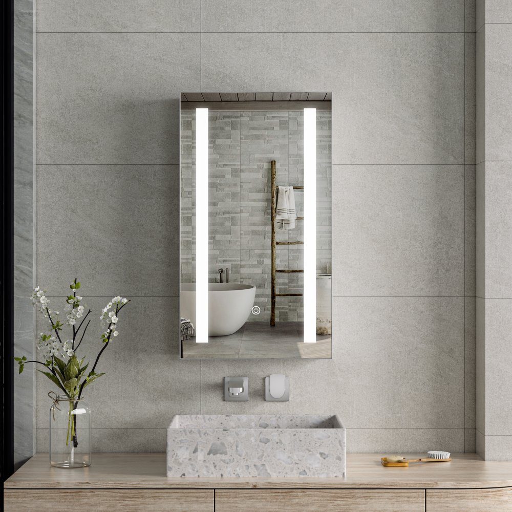 Dette elegante spejlskab kombinerer funktion og form i et kompakt format - perfekt til mindre badeværelser eller gæstetoiletter. Med sit minimalistiske design, lodrette LED-striber og skjulte opbevaring er skabet en både praktisk og visuelt tiltalende løsning. Det kobberfri spejl er integreret i skabslågen og giver et klart, naturligt spejlglas.