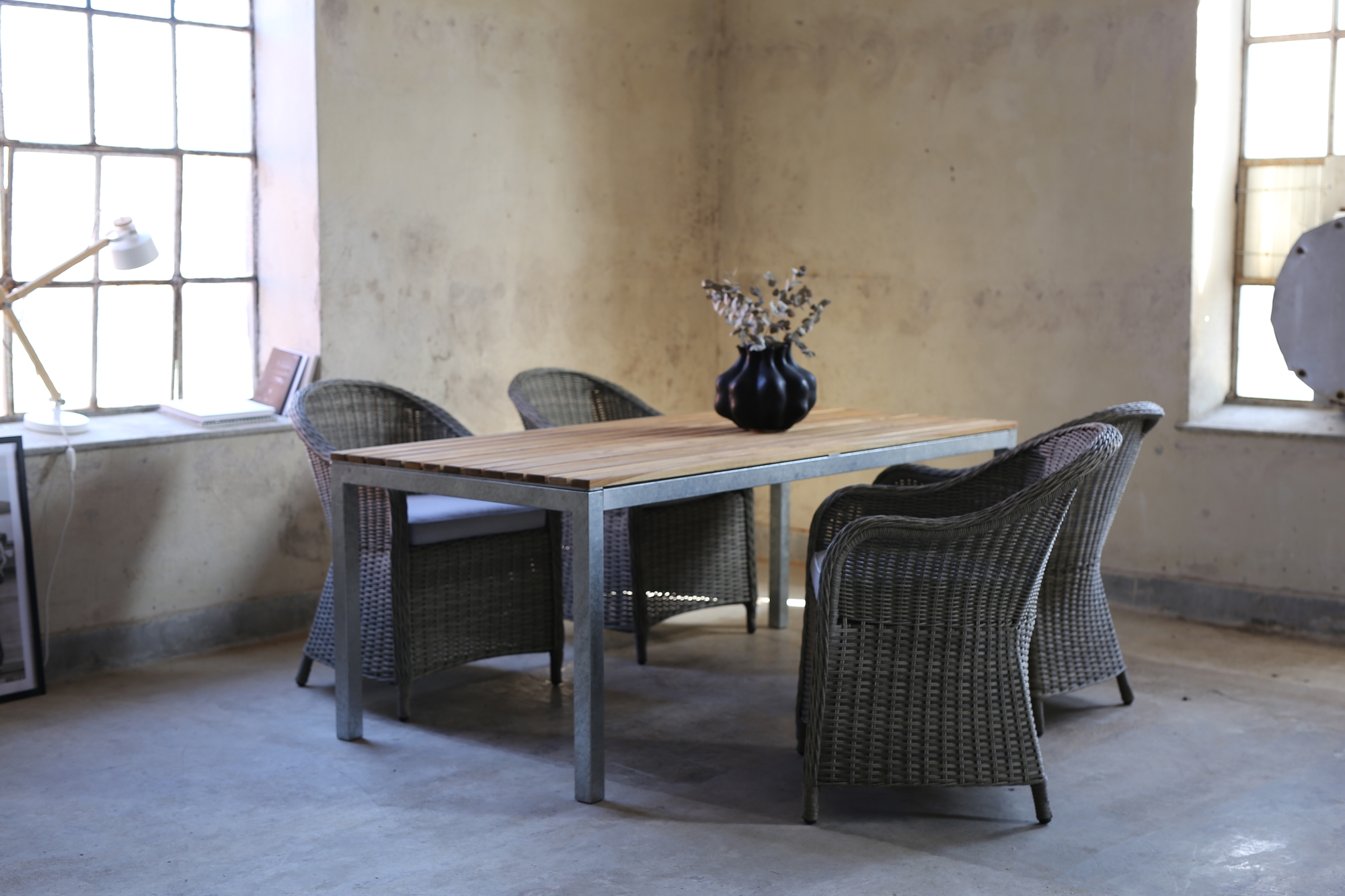 Spisegruppe til terrassen/udestuen. Alva spisebord 190x90 cm med stel i galvaniseret stål med massive teak stænger til top. Fire matchende kviksølvlænestole i brun kunstrattan gør dette til en god spisegruppe for hele familien.