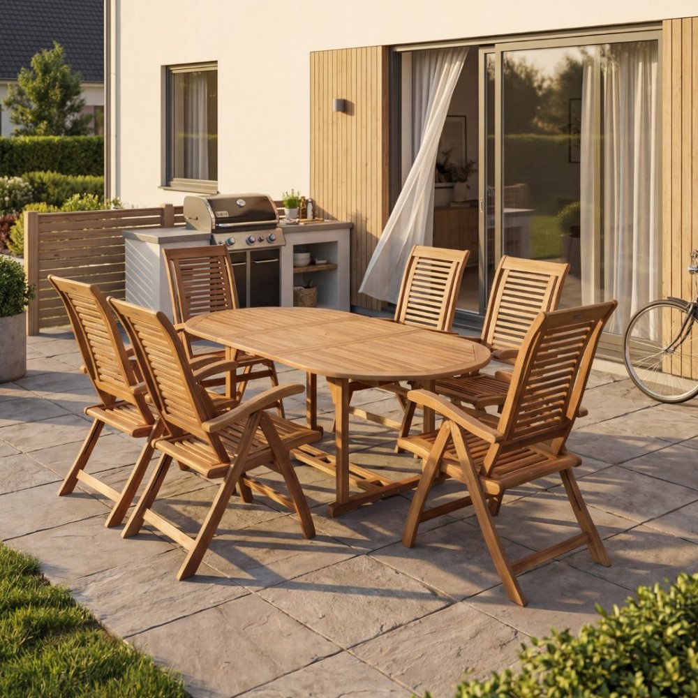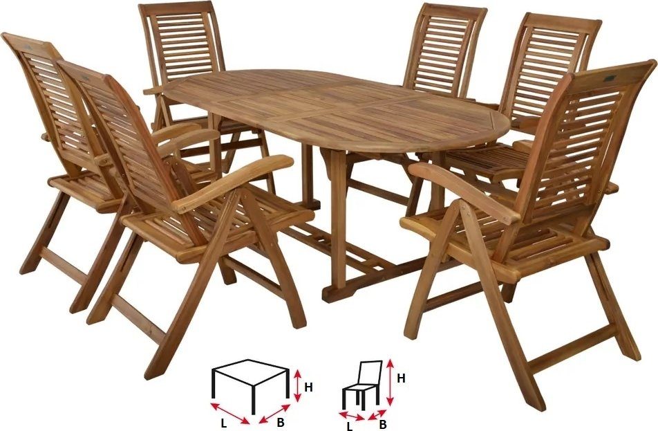 Sæt med eksklusive havemøbler, 1 bord og 6 (foldbare) stole i akacietræ. Velegnet til beskyttede terrasser. Møblerne kan bruges udenfor, hvis man sørger for korrekt overfladebehandling og god vedligeholdelse.