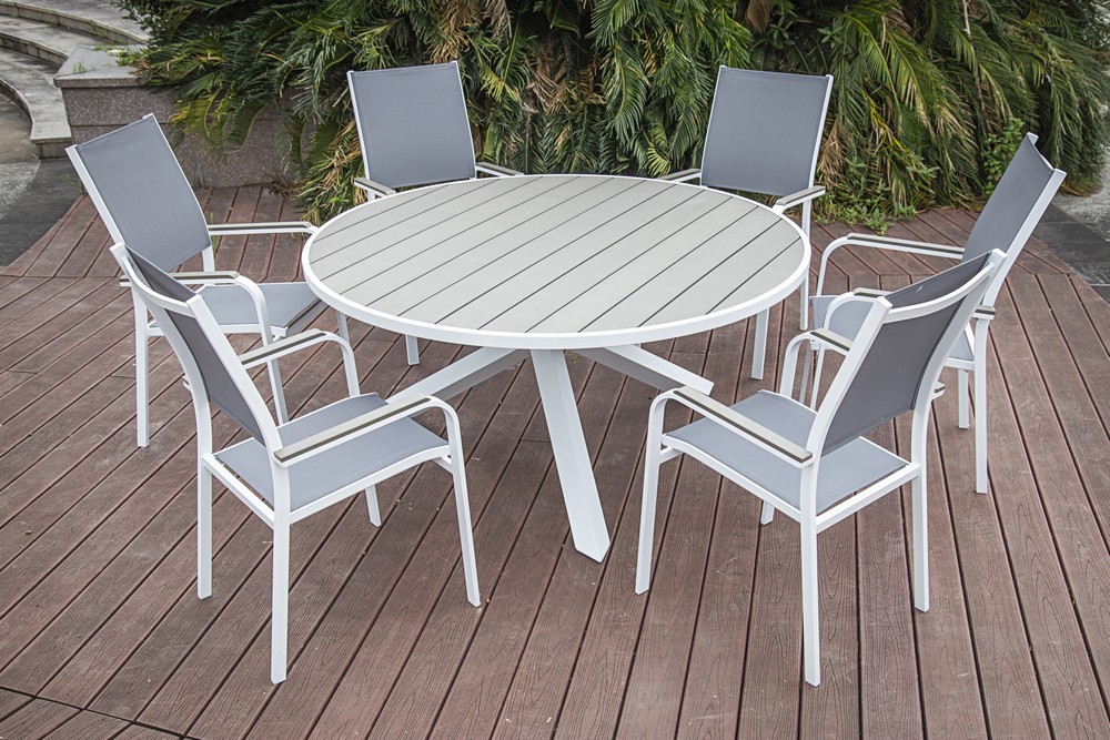 Spisesættet fås også med en bordstørrelse på Ø120, hvilket giver ekstra plads til større grupper. Uanset om du vil have en hyggelig middag udendørs eller en afslappende kaffepause, er denne udendørsgruppe en stilfuld og funktionel løsning.