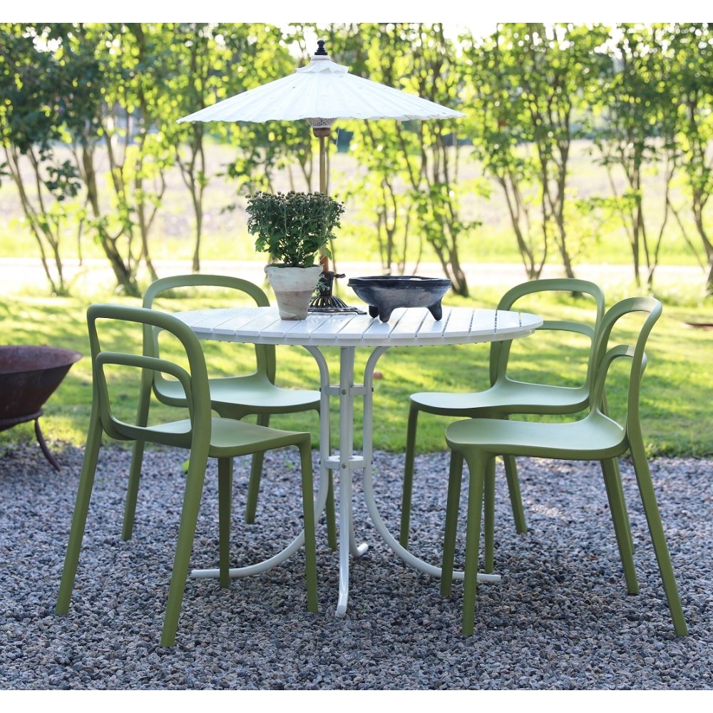 En smuk spisegruppe til terrassen. Holmsund rundt spisebord Ø103 cm i diameter med hvidlakeret fod og hvid aintwood plade. Spisesættet leveres med 4 stabelbare Nordanå stole i grøn formstøbt plast. En spisegruppe i harmoni, hvor møblerne går fint sammen og skaber en helhed, der er svær at slå. Passer lige så godt i udestuen som på altanen.