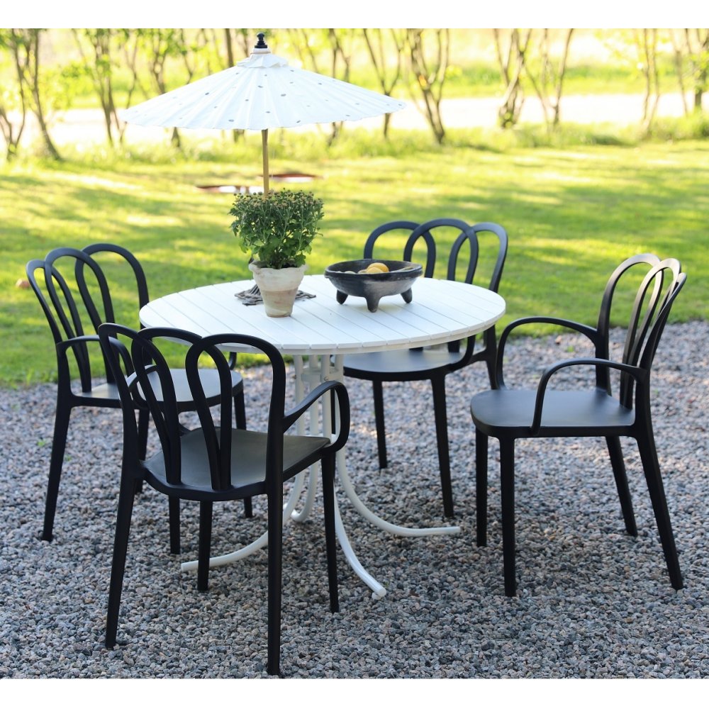 En smuk spisegruppe til terrassen. Holmsund rundt spisebord Ø103 cm i diameter med hvidlakeret fod og hvid aintwood plade. Spisegruppen leveres med 4 stabelbare Thornet stelstole i sort formstøbt plast. En spisegruppe i harmoni, hvor møblerne går fint sammen og skaber en helhed, der er svær at slå. Passer lige så godt i udestuen som på altanen.