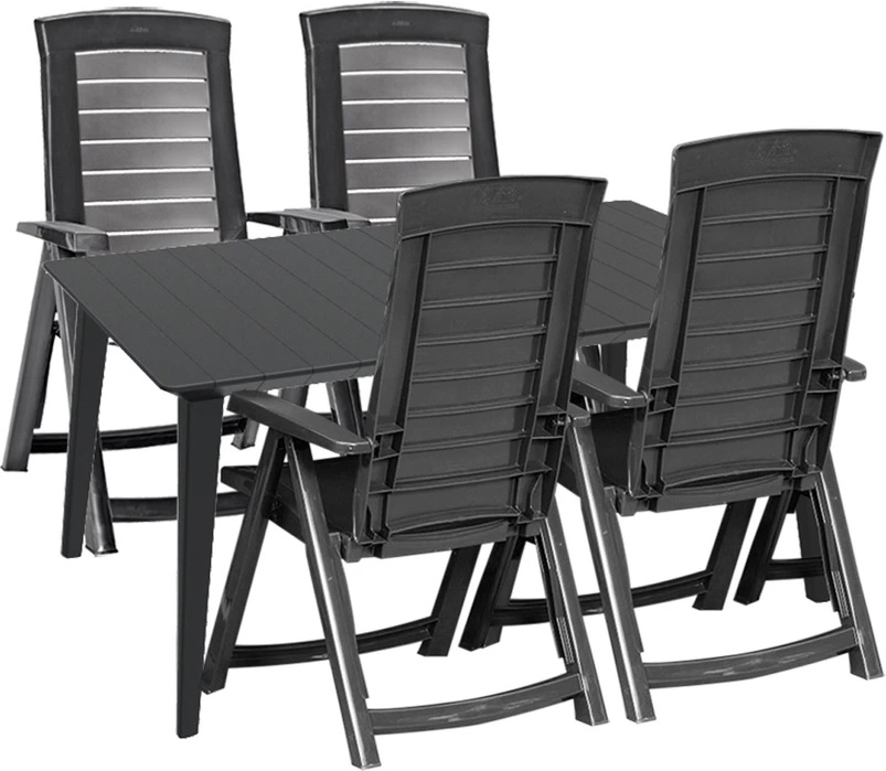 Praktisk havemøbelsæt bestående af fire justerbare stole og et bord. Velegnet til beskyttede haver, under balkoner og lignende.