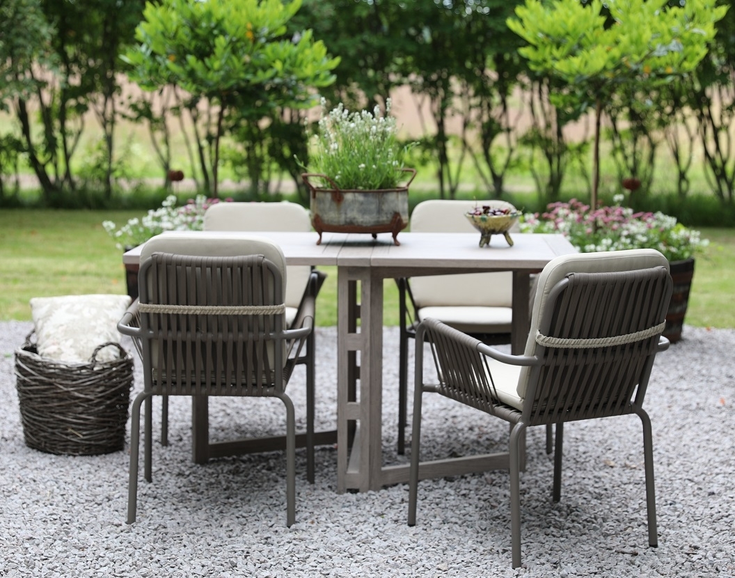 En smuk spisegruppe til terrassen, Saltö sofabord i grålakeret teaktræ med 4 matchende Lincoln stabelbare terrassestole i grålakeret aluminium med beige hynder. En spisegruppe i harmoni, hvor møblerne går fint sammen og skaber en helhed, der er svær at slå. Passer lige så godt i udestuen som på altanen.