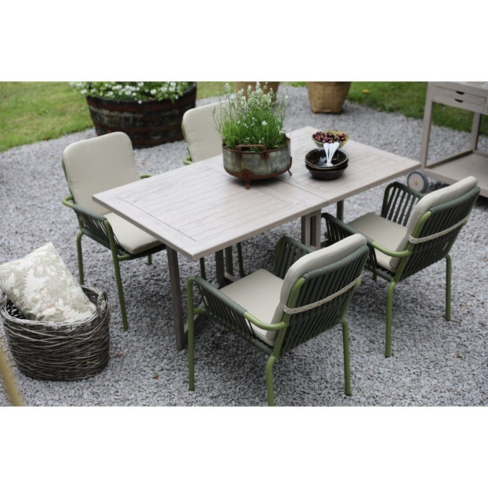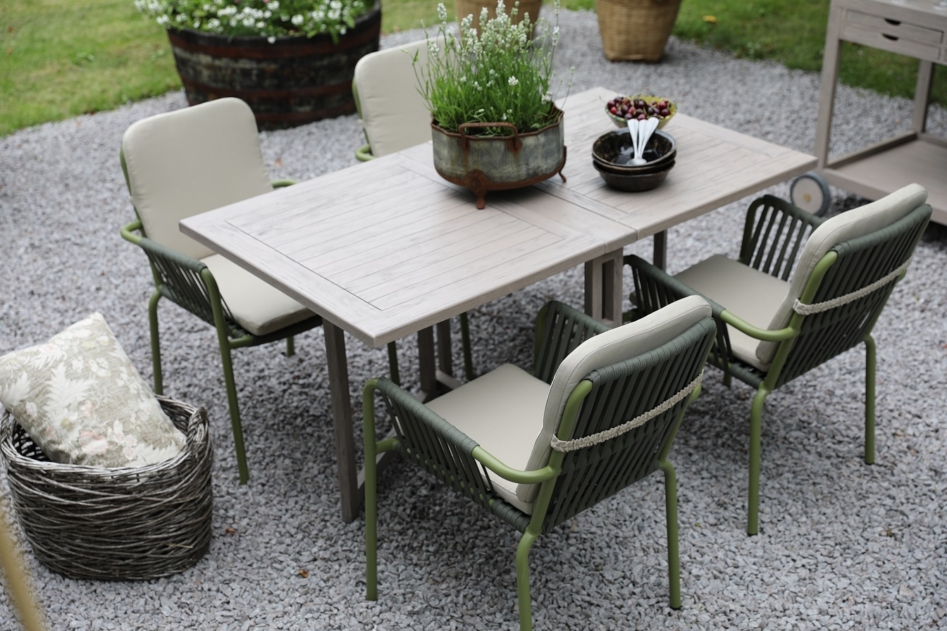 En smuk spisegruppe til terrassen, Saltö sofabord i grålakeret teaktræ med 4 matchende Lincoln stabelbare terrassestole i grønlakeret aluminium med beige hynder. En spisegruppe i harmoni, hvor møblerne går fint sammen og skaber en helhed, der er svær at slå. Passer lige så godt i udestuen som på altanen.