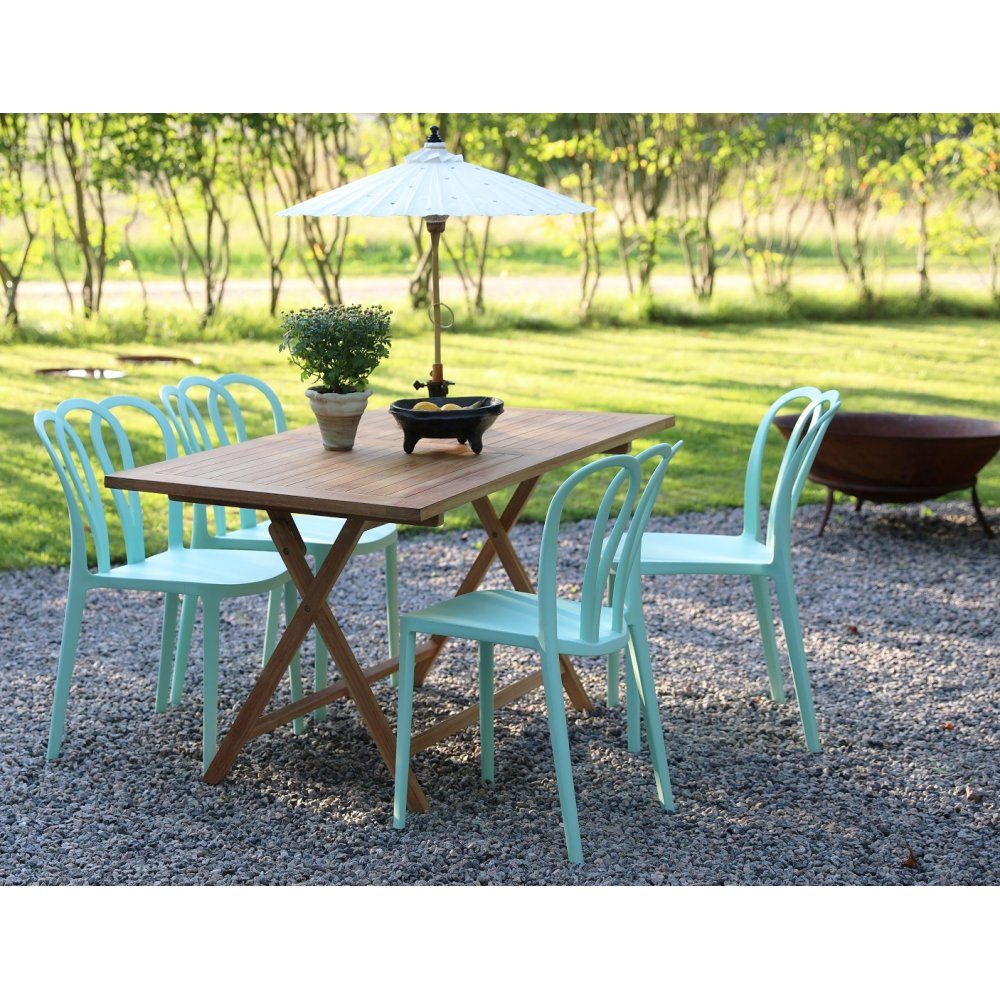 En smuk spisegruppe til terrassen. Saltö knock-bord i teaktræ med 4 stabelbare Bally-stole i mintgrøn formstøbt plast. En spisegruppe i harmoni, hvor møblerne går fint sammen og skaber en helhed, der er svær at slå. Passer lige så godt i udestuen som på altanen.