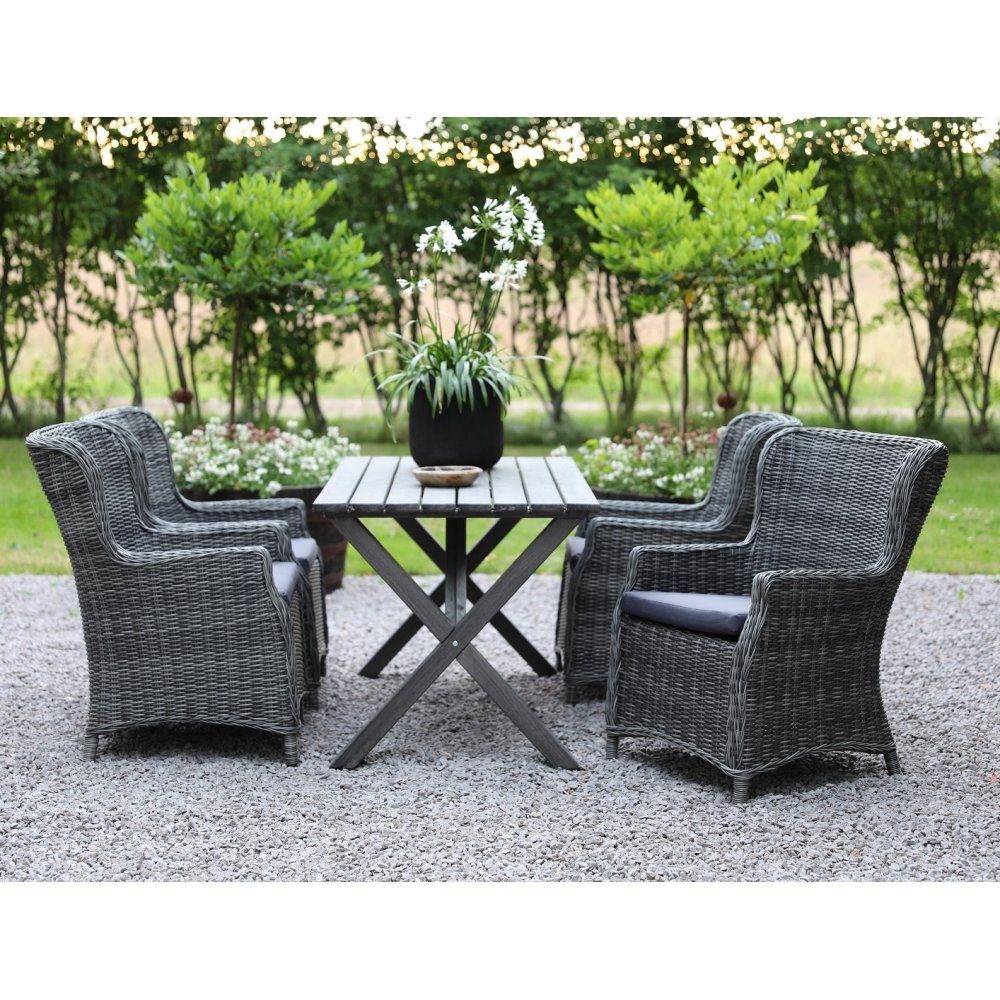 Spisegruppe til udendørsmøblerne, 150 cm langt bord i grålaseret fyrretræ med krydsben og 4 matchende Jacksonville lænestole med høj ryg i grå kunstrattan med mørkegrå hynde. En spisegruppe i harmoni, hvor møblerne går fint sammen og skaber en helhed, der er svær at slå. Passer lige så godt i udestuen som på altanen. Bordet er blevet behandlet for at få den patina, man forbinder med Shabby Chic. Da dette arbejde udføres i hånden, har hvert eksemplar et unikt udseende.