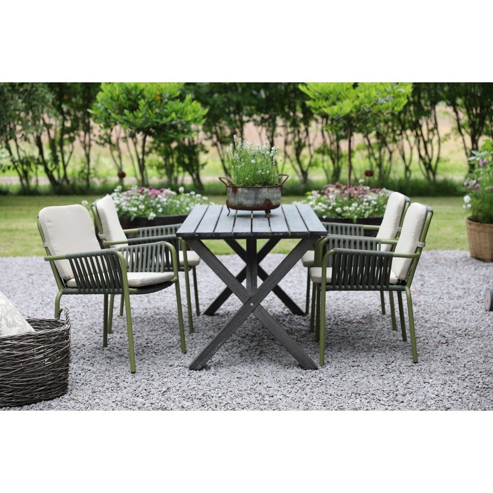 Spisegruppe til udendørsmøblerne, 150 cm langt bord i grålaseret fyrretræ med krydsben og 4 matchende komfortable Lincoln-stole i grønlakeret aluminium med beige hynde. Stolene kan stables for nem opbevaring. En spisegruppe i harmoni, hvor møblerne går fint sammen og skaber en helhed, der er svær at slå. Passer lige så godt i udestuen som på altanen. Bordet er blevet behandlet for at få den patina, man forbinder med Shabby Chic. Da dette arbejde udføres i hånden, har hvert eksemplar et unikt udseende.