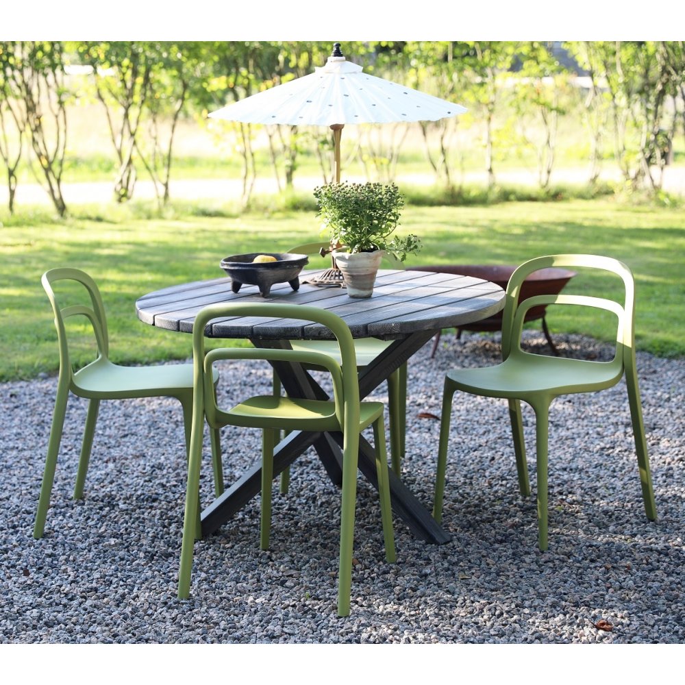 En smuk spisegruppe til terrassen. Scottsdale rundt bord Ø112 cm i diameter i grålaseret fyrretræ med 4 stabelbare Nordanå stole i grøn formstøbt plast. En spisegruppe i harmoni, hvor møblerne går fint sammen og skaber en helhed, der er svær at slå. Passer lige så godt i udestuen som på altanen.