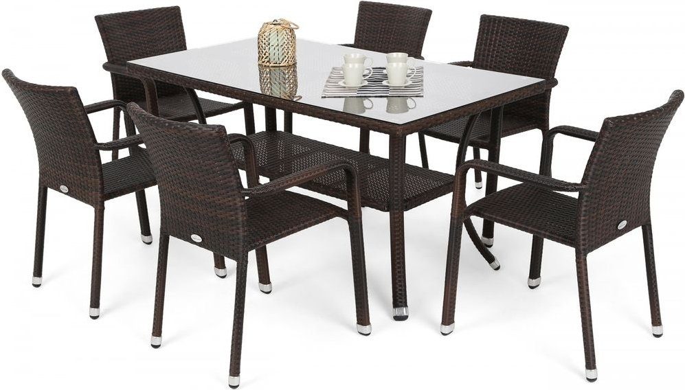 Udendørs spisegruppe med bord og seks stole, der kan stables. Lavet af pulverlakeret aluminium og klædt i kunstig rotting. Bordet har en topplade lavet af 5 mm hærdet glas.