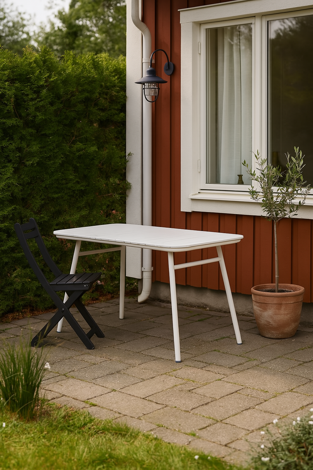 Bordpladen er lavet af slidstærkt træ og hviler på en stabil hvidlakeret metalramme, hvilket gør bordet både vejrbestandigt og vedligeholdelsesfrit. De stabelbare stole er lavet af det samme slidstærke materiale og følger bordets rene designlinjer. Sammen skaber de en funktionel og stilfuld udendørsgruppe, der kan rumme hele selskabet.