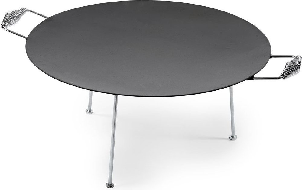 Stegeplade lavet af 3 mm varmtvalset stål. 3 aftagelige ben medfølger. Håndtag på to sider af stegepanden for nem bevægelse.