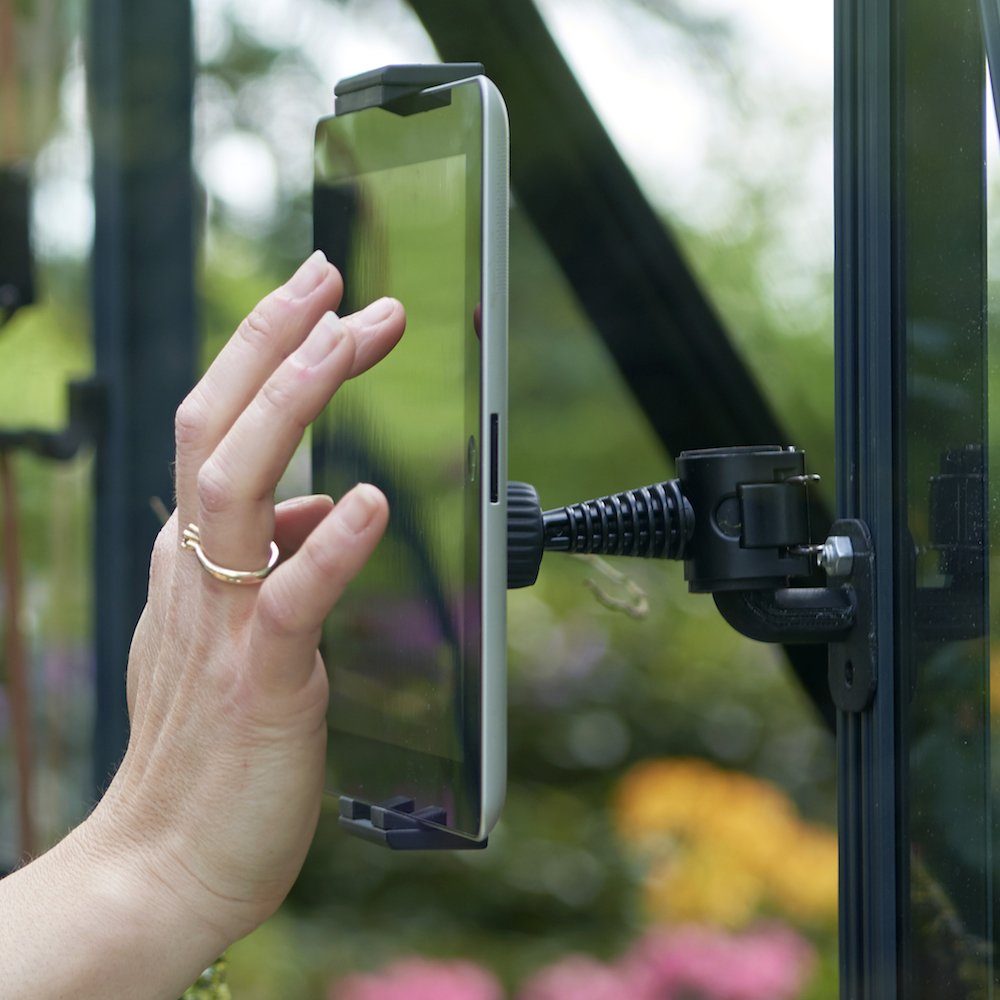 En tablet-holder, der monteres i drivhusets profilsystem.