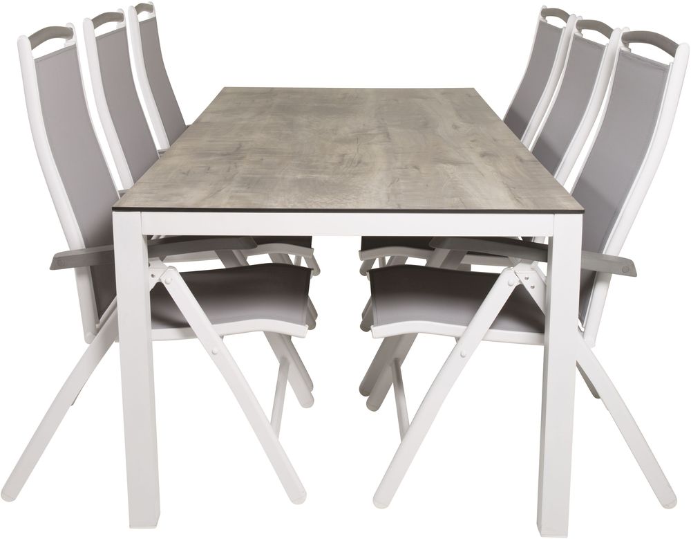 Spisegruppe med et bord og 6 stykker stole. Stolene er lavet af Aluminium/Aintwood/Tekstilerne og bordet er lavet af Laminat/Aluminium.