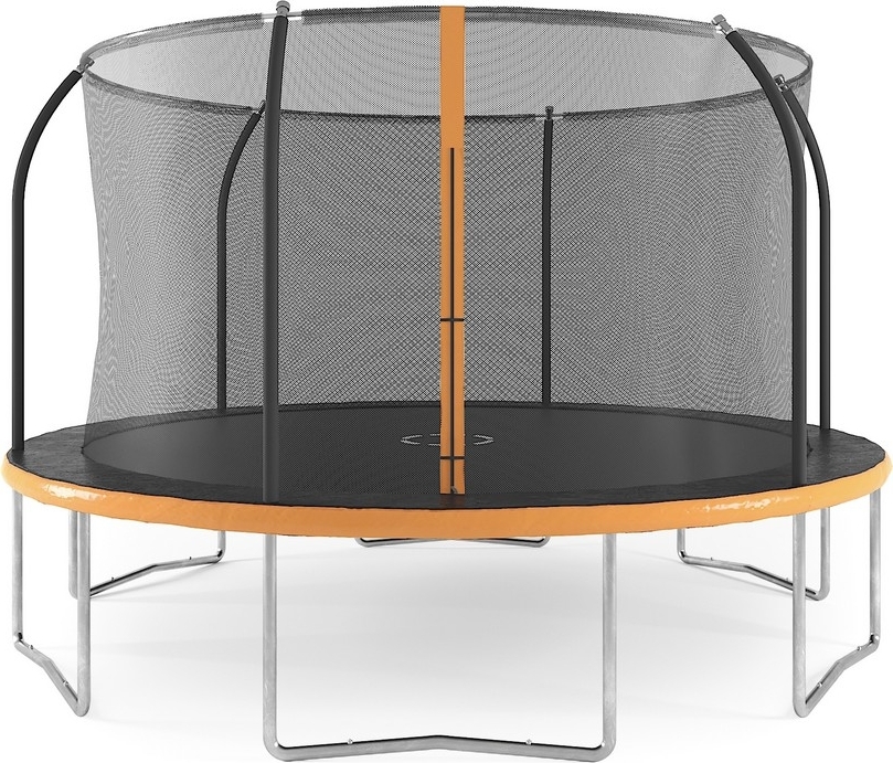 Stilfuld trampolin i sort og orange, der passer ind i alle haver.