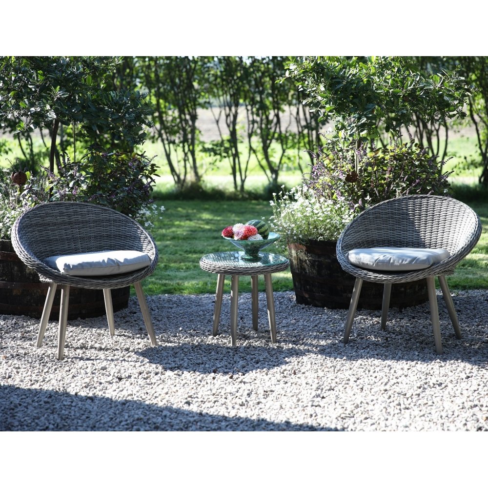 Dejlig lille loungegruppe, der ikke fylder for meget. Gruppen er meget rund i formen og giver en blød fornemmelse. Derfor gør den sig godt på de fleste overflader, altaner og terrasser. Pakken indeholder to stole med hynder og et bord lige til morgenmad eller kaffe.