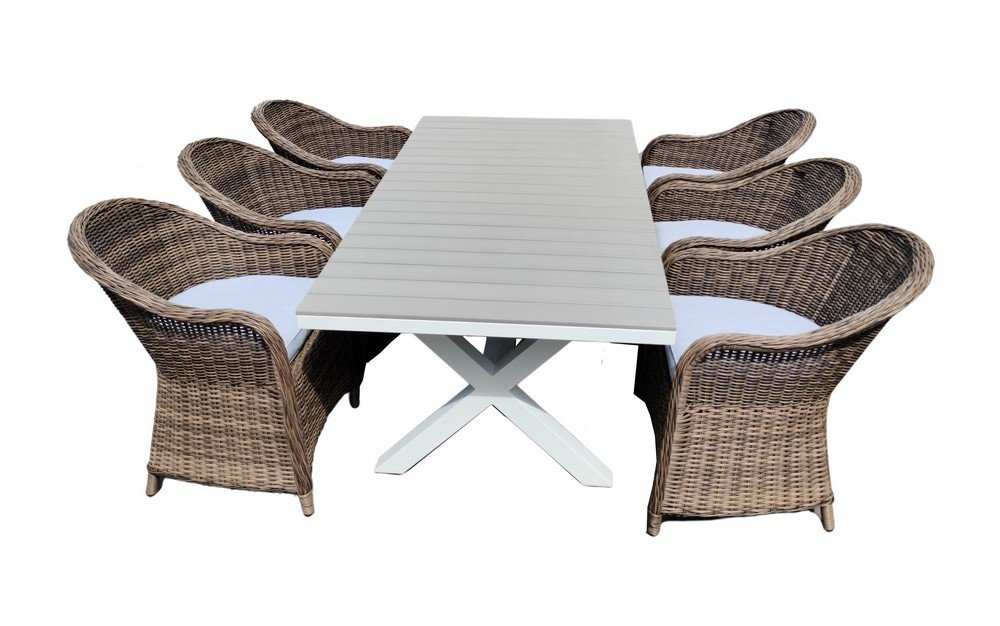 Mercury er et udendørs møbelsæt i skøn polyrattan, der giver en neutral naturfølelse. Farverne får møbelsættet til at passe ind i de fleste miljøer. Lænestolene er rummelige og har inkluderet pude til sædet. Møbelsættets ramme er lavet af stabil og let aluminium. Perfekt til mindeværdige øjeblikke med familie og venner på terrassen eller i haven.