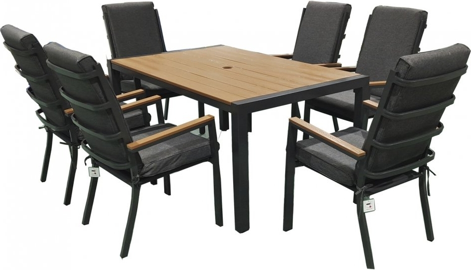 Spisebordet har en brun bordplade lavet af slidstærkt polywood, der giver et trælignende udseende uden at kræve vedligeholdelse. Den stabile ramme er lavet af vejrbestandigt aluminium, hvilket også gælder for lænestolene. Stolene suppleres af grå hynder, der bidrager til både komfort og stil. Kombinationen af aluminium og polywood giver et moderne og vedligeholdelsesvenligt udseende, der holder i lang tid.