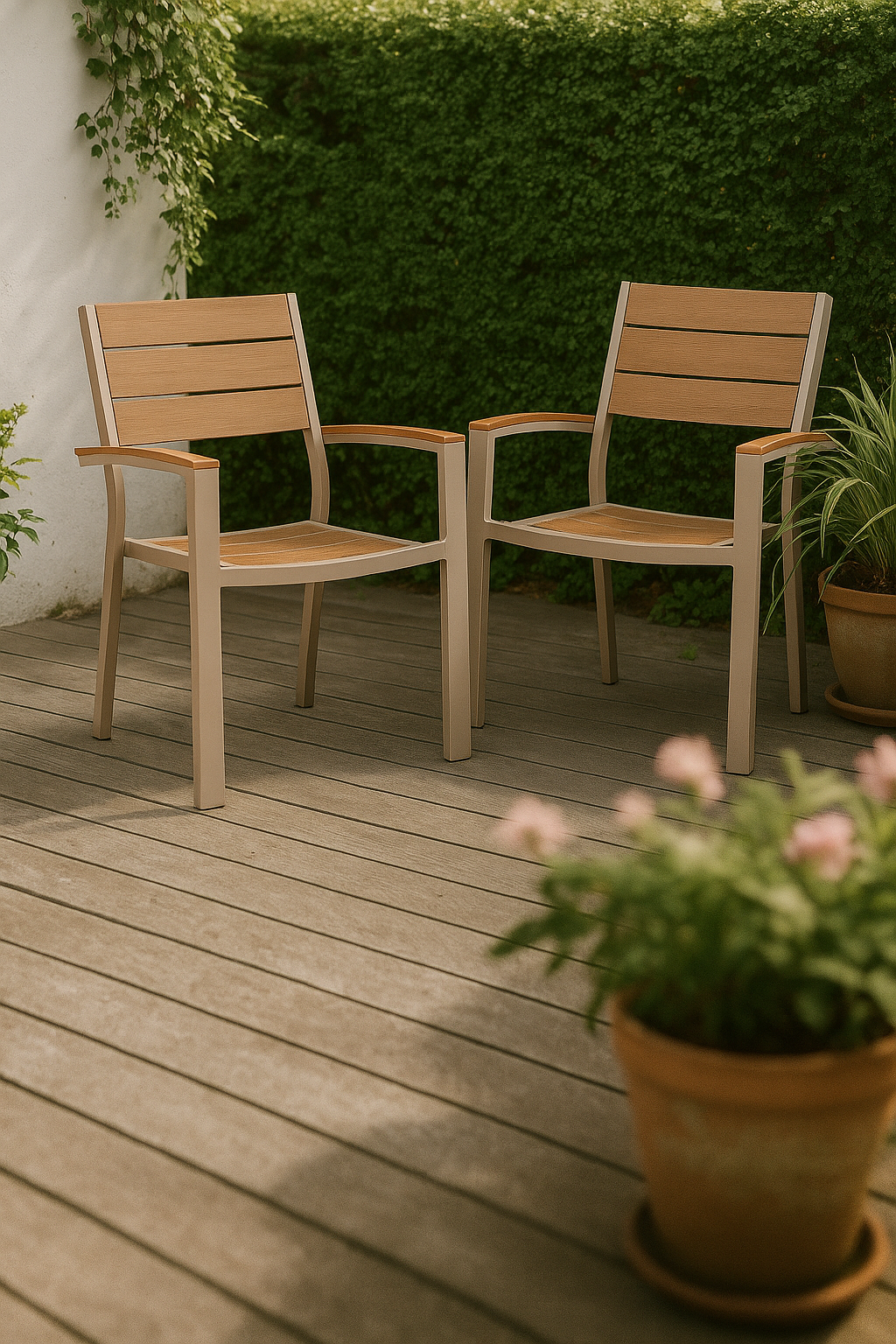Den beige-lakerede aluminiumsramme er let, rustfri og kræver minimal vedligeholdelse. Noonwood er et slidstærkt plastmateriale med en træfornemmelse, designet til at modstå sol, regn og temperaturændringer. Perfekt til dem, der ønsker at bruge mere tid på at nyde - og mindre tid på at underholde.